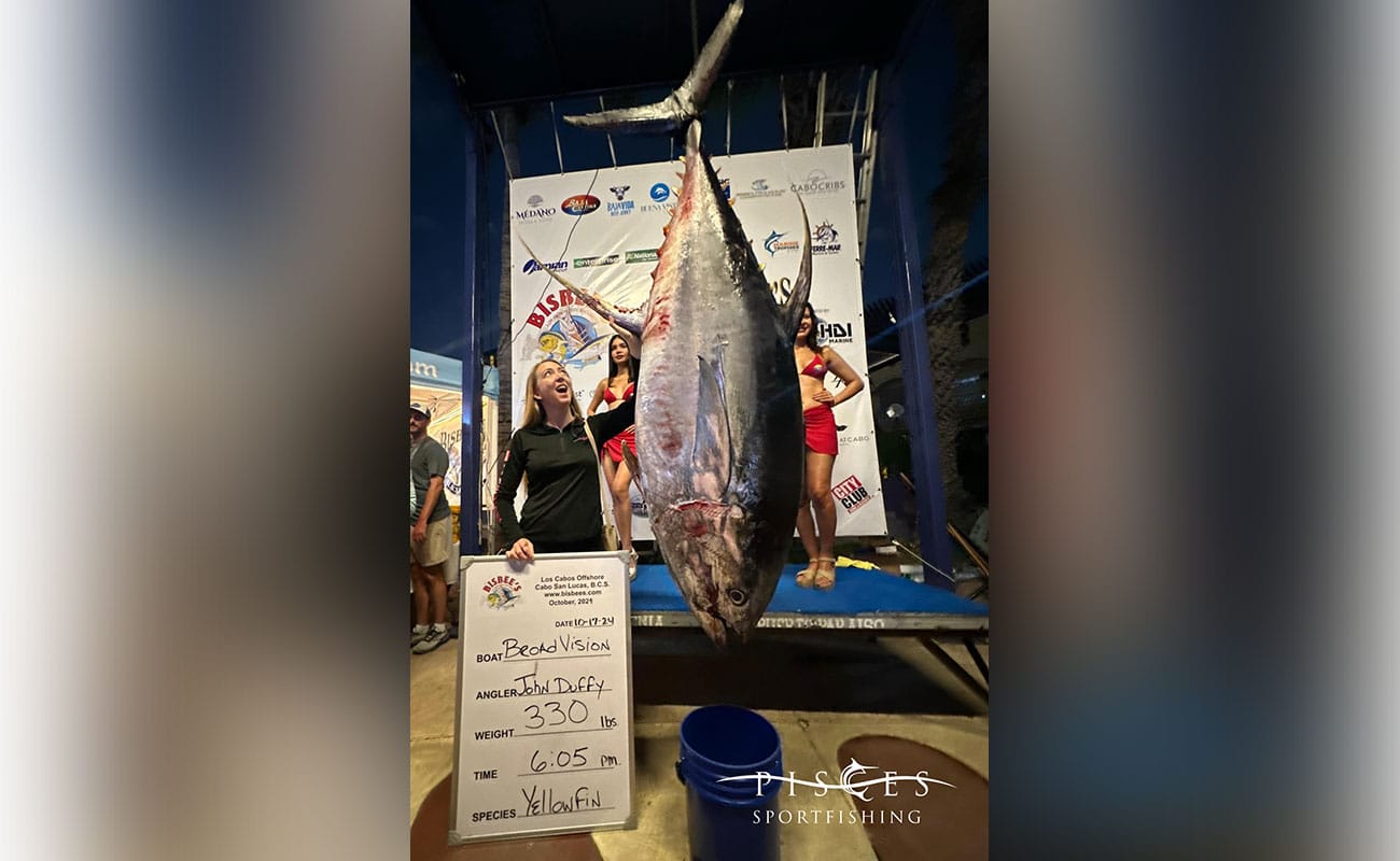 On Day Two of the Bisbee’s Los Cabos Offshore tournament, history was made with one of the biggest tuna catches ever recorded! Team Broad Vision reeled in an absolutely massive tuna, weighing a jaw-dropping 330 pounds. It’s quite possibly the biggest tuna ever to be weighed in the history of Cabo’s fishing tournaments!