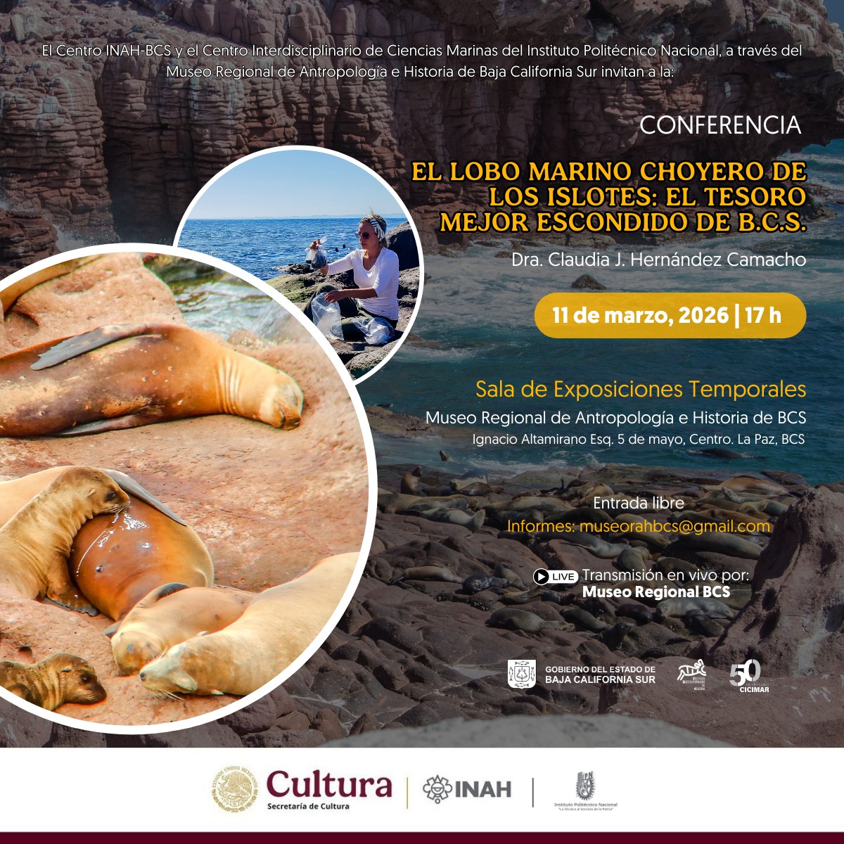 Mar 11 5:00 pm - 7:00 pm The choyero Sea Lion of the Islets – Conference Museo Regional de Antropología e Historia de BCS Calle Ignacio Altamirano s/n, Zona Central, La Paz, B.C.S., La Paz Event Details Get Directions