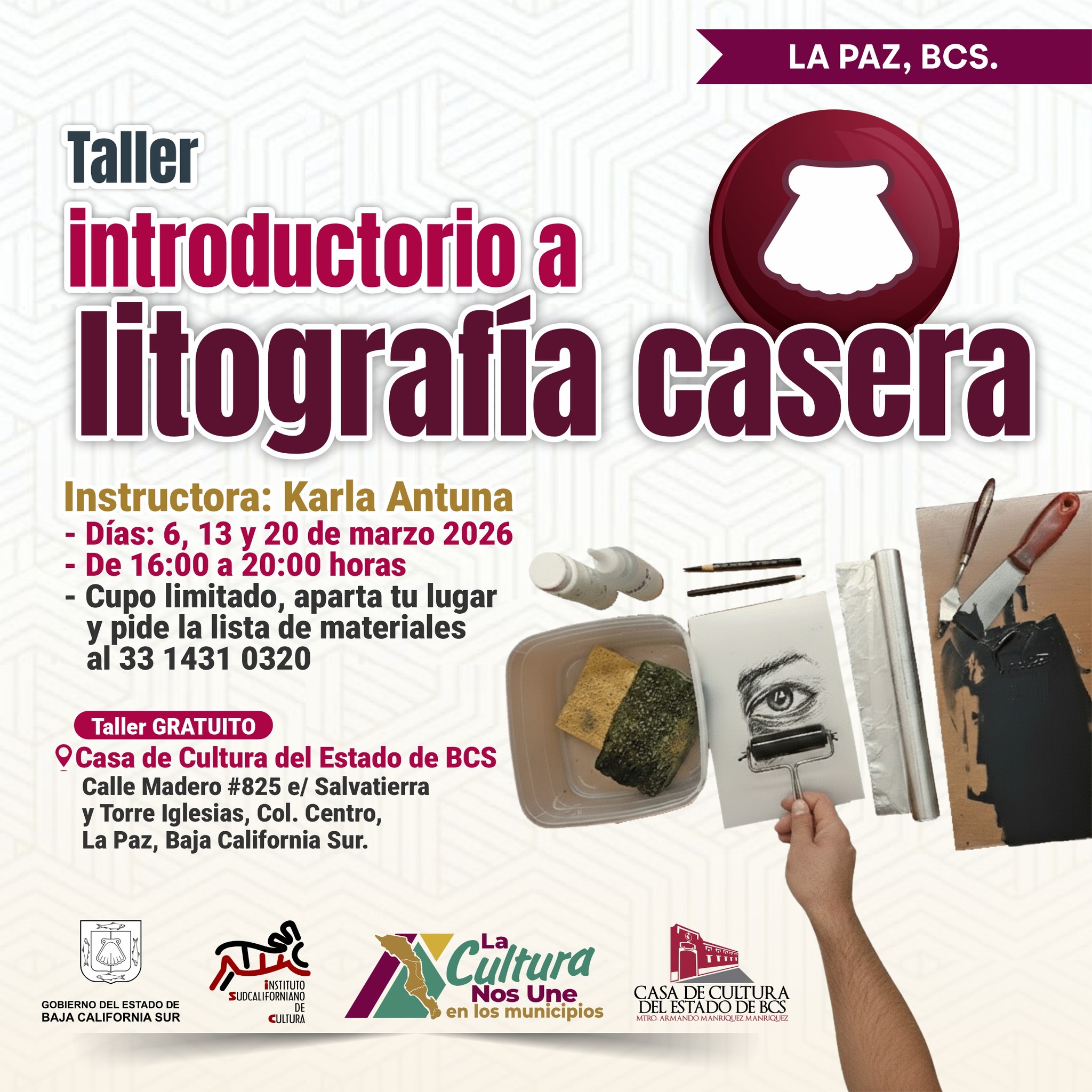 Mar 13 4:00 pm - 8:00 pm Homemade Lithograph – workshop Casa de Cultura Baja California Sur calle Francisco I. Madero #825 entre Manuel Torre Iglesias Juan María de Salvatierra y, Esterito, La Paz, B.C.S, La Paz Event Details Get Directions