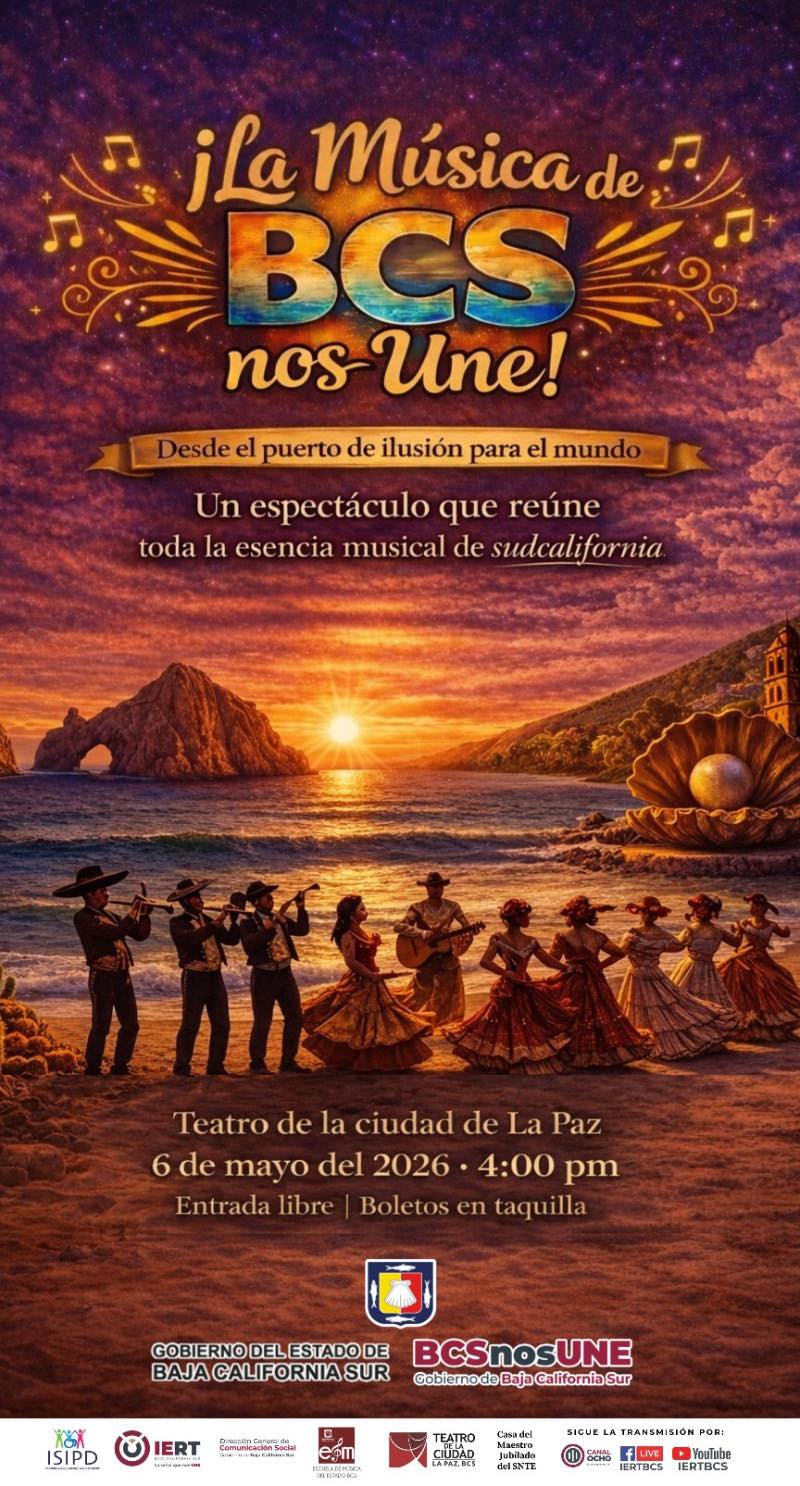 May 6 4:00 pm - 6:00 pm The Music of Baja California Sur Unites Us – Play Teatro de la Paz Antonio Navarro e/ Altamirano y H, de Independencia Centro, Zona Central, 23000 La Paz, B.C.S., La Paz Event Details Get Directions