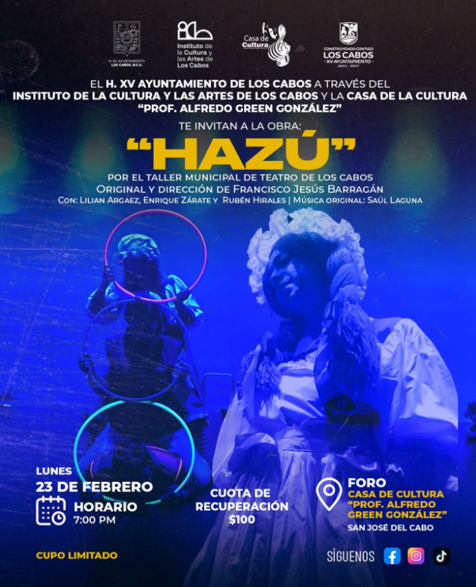 The XV City Council of Los Cabos, through the Instituto de la Cultura y las Artes de Los Cabos and the Casa de la Cultura “Prof. Alfredo Green González,” invites the public to the theatrical production “Hazú.”