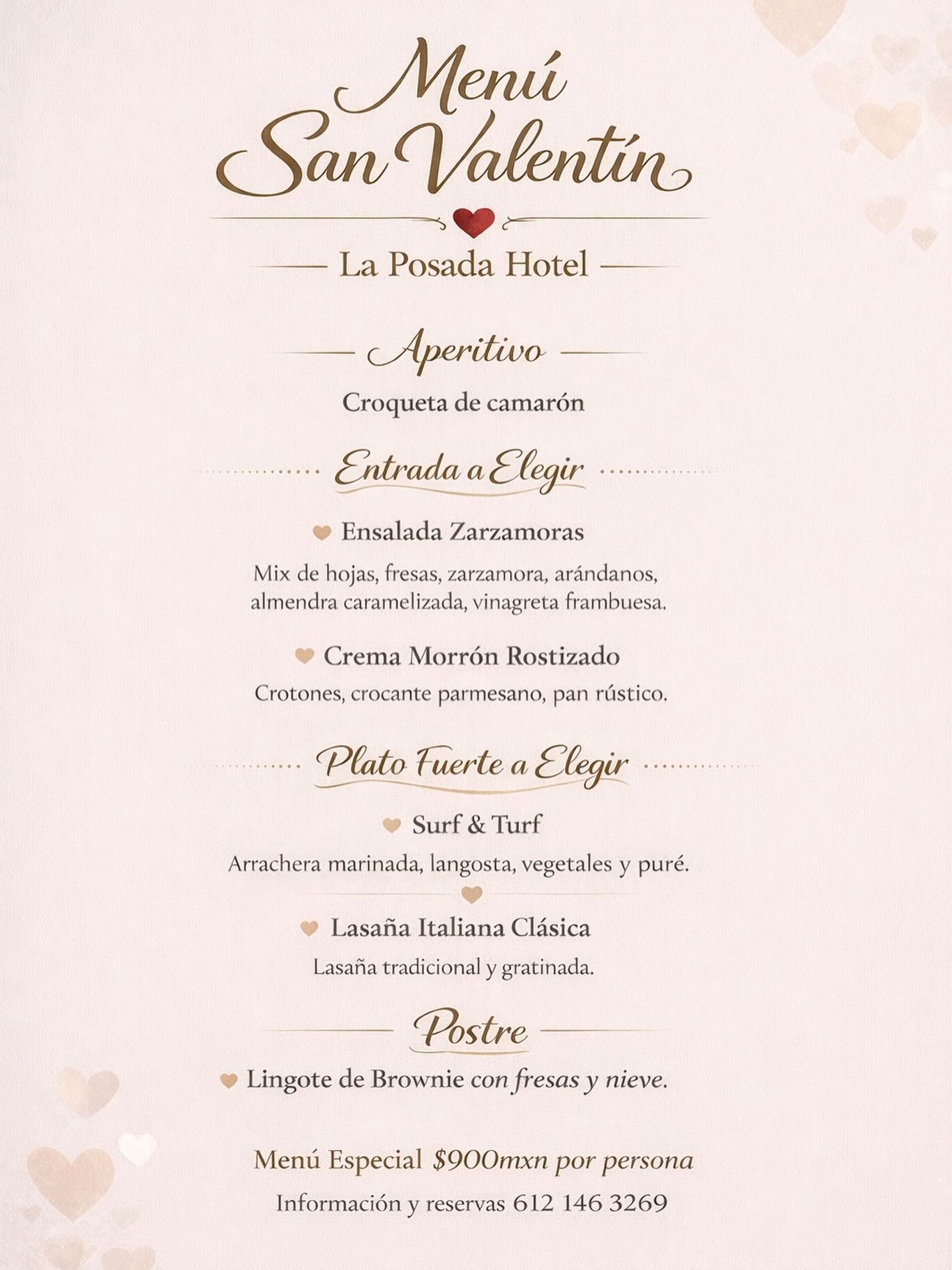 Celebrate love with a specially crafted Valentine’s Day dining experience at La Posada Hotel. Enjoy a refined multi-course menu featuring a shrimp croquette appetizer, your choice of fresh starters, and elegant main dishes such as Surf & Turf or classic Italian lasagna. End the evening on a sweet note with a decadent brownie dessert served with strawberries and ice cream. A perfect setting for a romantic and memorable celebration. 💕🍽️